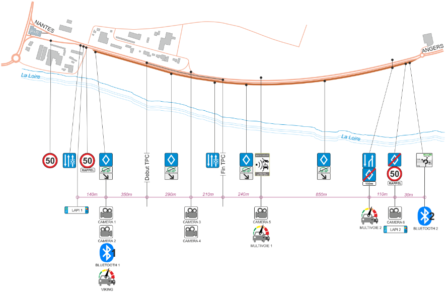 - Des capteurs Bluetooth pour mesurer les temps de parcours de l’ensemble des véhicules captés le long de la section aménagée ;