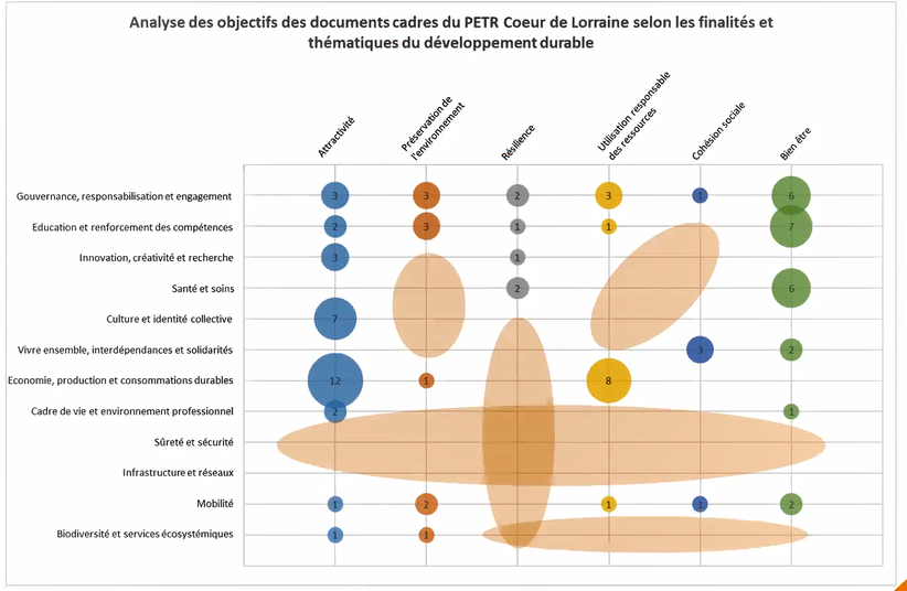 Ainsi, à l’intersection d’une finalité (colonne) et d’un domaine d’action (ligne) de cette grille se trouve le nombre d’objectifs opérationnels des documents stratégiques du territoire concernés.
