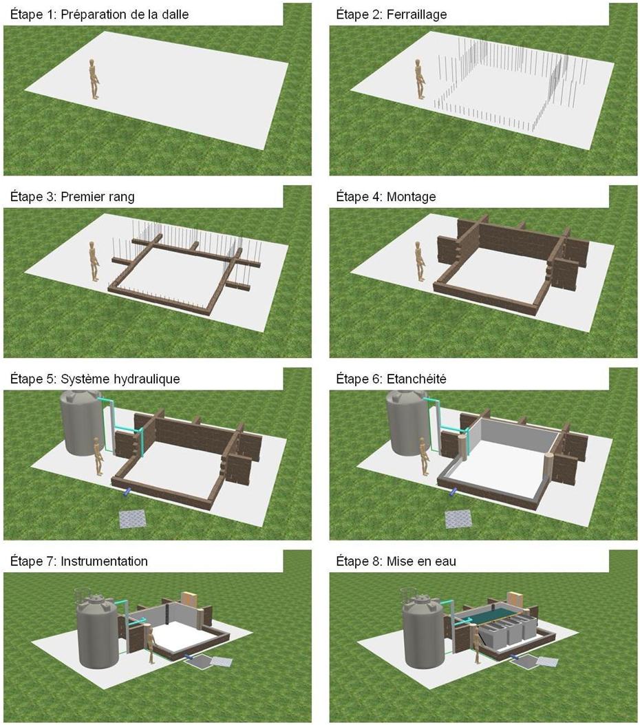 Le bassin comprendra plusieurs sections essentielles au bon déroulement des tests et à la précision des mesures. La section principale sera dédiée à la mise à l’eau des modules anti-inondations, tandis qu’un bassin de récupération recueillera l’eau s’écoulant à travers ces modules. Cette configuration permettra de calculer le débit de fuite global grâce à une cuve de sortie équipée de débitmètres. Un système de remplissage de 15 m³ maintiendra le volume d’eau constant durant les tests, grâce à un système hydraulique en circuit fermé.