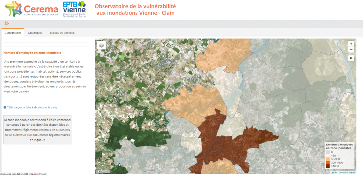 Pour chaque indicateur de vulnérabilité sont consultables : une définition de l’indicateur, une carte dynamique (avec un gestionnaire de couches permettant d’afficher entre autres celle de l’aléa centennal), des graphiques interactifs et le tableau des données numériques. Si l’utilisateur le souhaite, il peut télécharger la fiche de l’indicateur qui lui donnera des explications plus techniques notamment sur les modalités de calcul, les données d’entrées ou les points de vigilance, et enfin, la carte imprimable en format pdf.