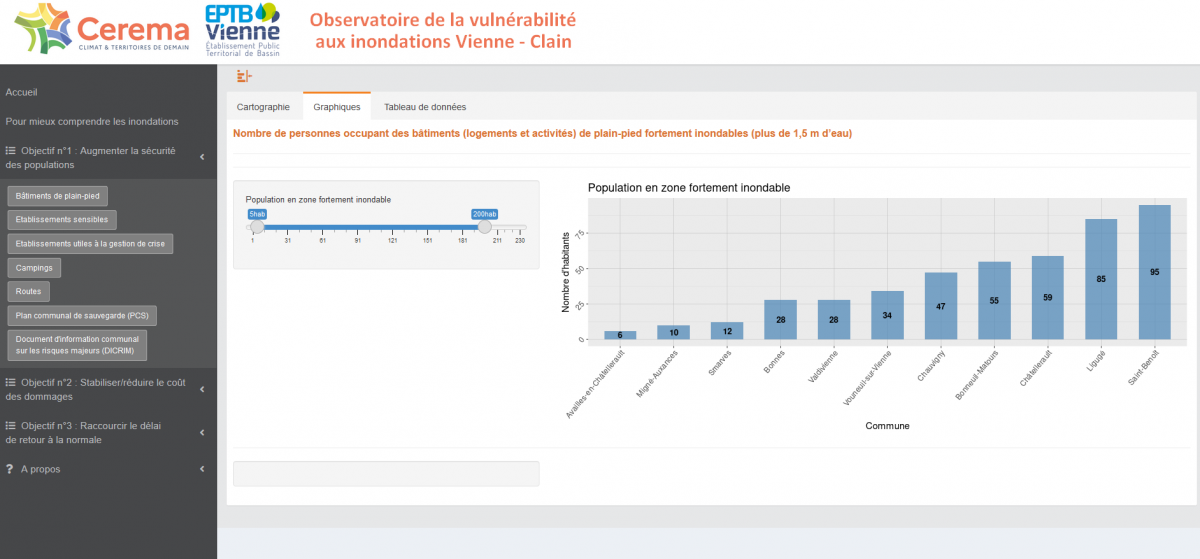 Le but final est la création d'un outil de visualisation en ligne des données de vulnérabilité actualisables sur le territoire à destination de différents publics. Pour les décideurs locaux en particulier, l’outil pourrait donc participer à l’évaluation de la politique publique sur les risques d’inondations grâce au suivi des effets des actions conduites localement. De ce point de vue, l’outil de visualisation de la vulnérabilité constituerait également un outil d’aide à la décision.