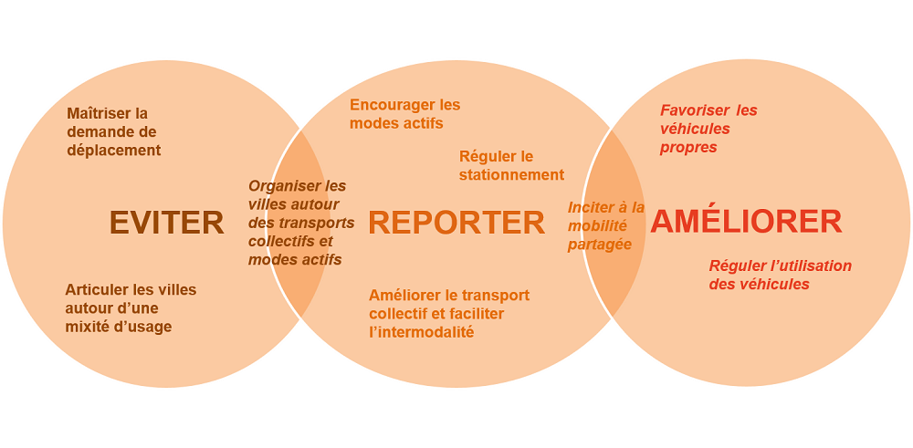 Les trois axes principaux, éviter, réduire et améliorer, sont directement inspirés de l’approche Avoid-Shift-Improve établie en Allemagne dès le début des années 1990 et largement disséminée depuis.