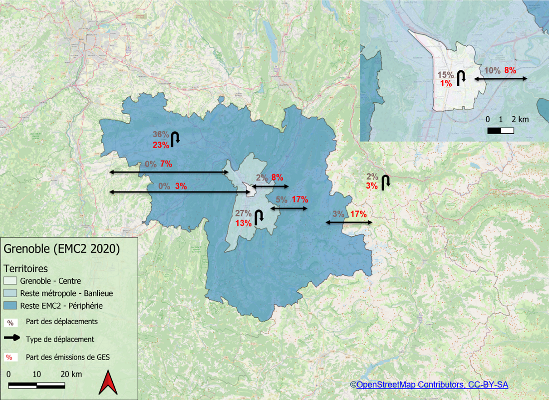 L’analyse spécifique portant sur l’enquête de Grenoble a servi quant à elle de cas d’usage pour soulever les questions liées à la (géo-)visualisation des résultats de l’analyse ainsi qu’à son adaptation à des problématiques spécifiques au territoire. Une analyse plus fine de chacun des indicateurs élaborés, à l’échelle infra-enquête, permet en outre de mettre en évidence d’importantes disparités territoriales cachées derrière les indicateurs moyens calculés à l’échelle d’un territoire d’enquête.