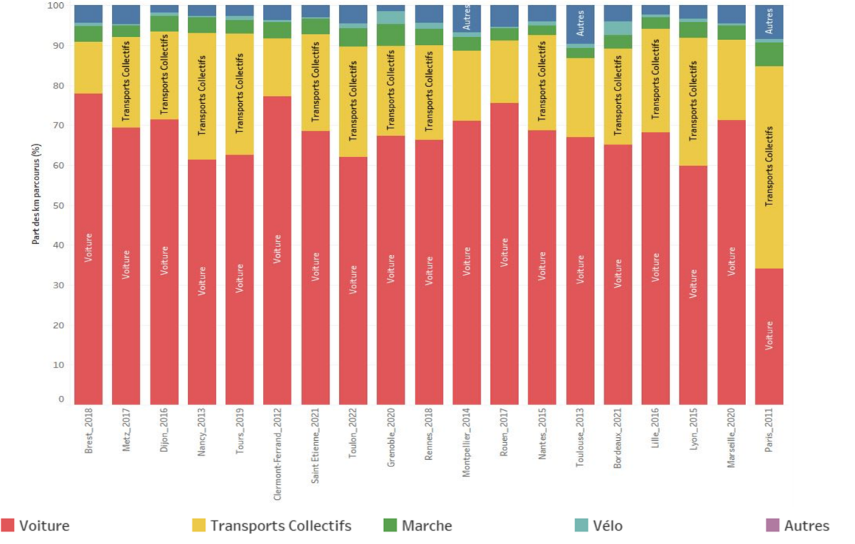 Ce premier travail a soulevé une réflexion plus spécifique sur les constats et enjeux liés au défi de la décarbonation des mobilités au sein de 19 métropoles françaises, visant à mettre en lumière les particularités de ces territoires et des flux de déplacement qui s’y inscrivent (internes à la métropole, d’échange avec la ville-centre ou d’échange avec l’extérieur, par exemple). Ce deuxième axe de travail a été synthétisé dans une fiche Cerema à paraître et mettant notamment en évidence, pour les 19 métropoles concernées, le rôle des distances parcourues et des déplacements radiaux (d’échange entre la métropole et l’extérieur par exemple) de moyenne distance dans les émissions de gaz à effet de serre.
