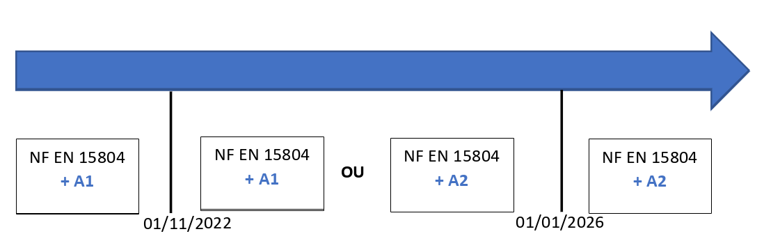 L’amendement A2 à la norme européenne 15804 a été publié en octobre 2019 avec un délai de mise en application pouvant aller jusqu’à trois ans. Délai tenu par la France puisque la norme NF EN 15 804+ A2 est entrée en application avec son complément national au 1ernovembre 2022.