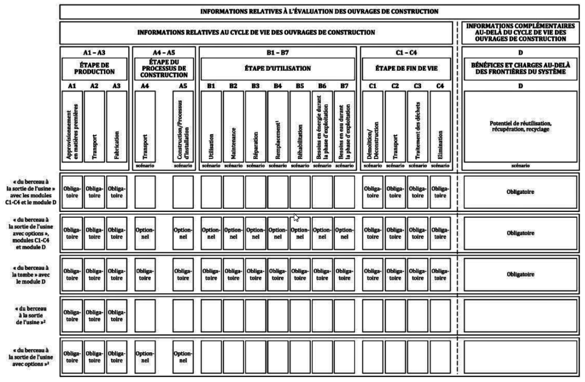 Tous les produits et matériaux de construction doivent déclarer les modules A1→A3, les modules de fin de vie C1→C4 et le module D (cf. illustration 1 pour la signification des modules).