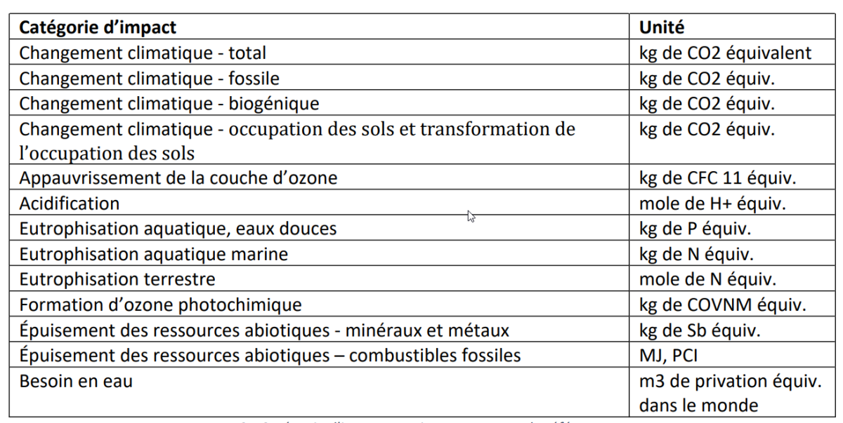 Voici la liste des catégories d’impacts environnementaux de référence devant être inclus dans chaque module déclaré d’une DEP.