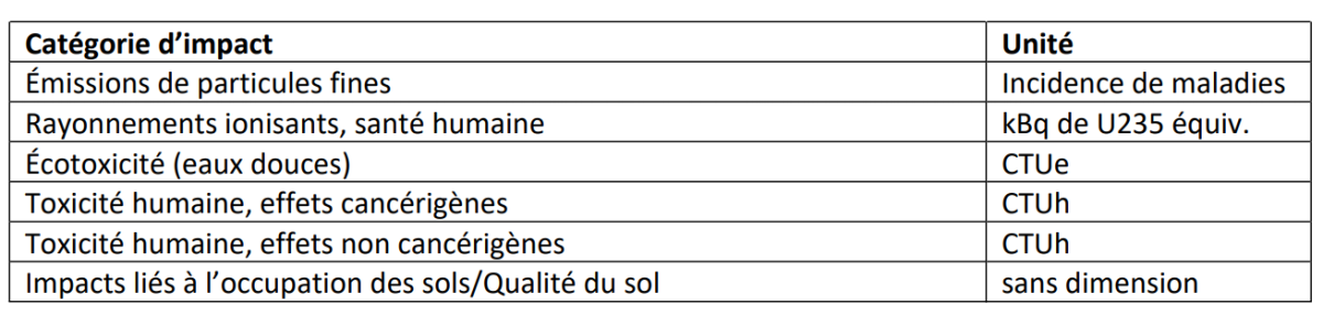 Voici la liste des catégories d’impacts environnementaux additionnels :