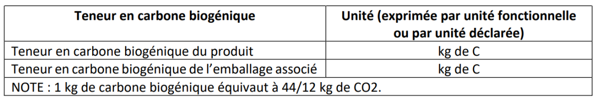 Les informations sur la teneur en carbone biogénique doivent être incluses dans la DEP de la façon suivante :