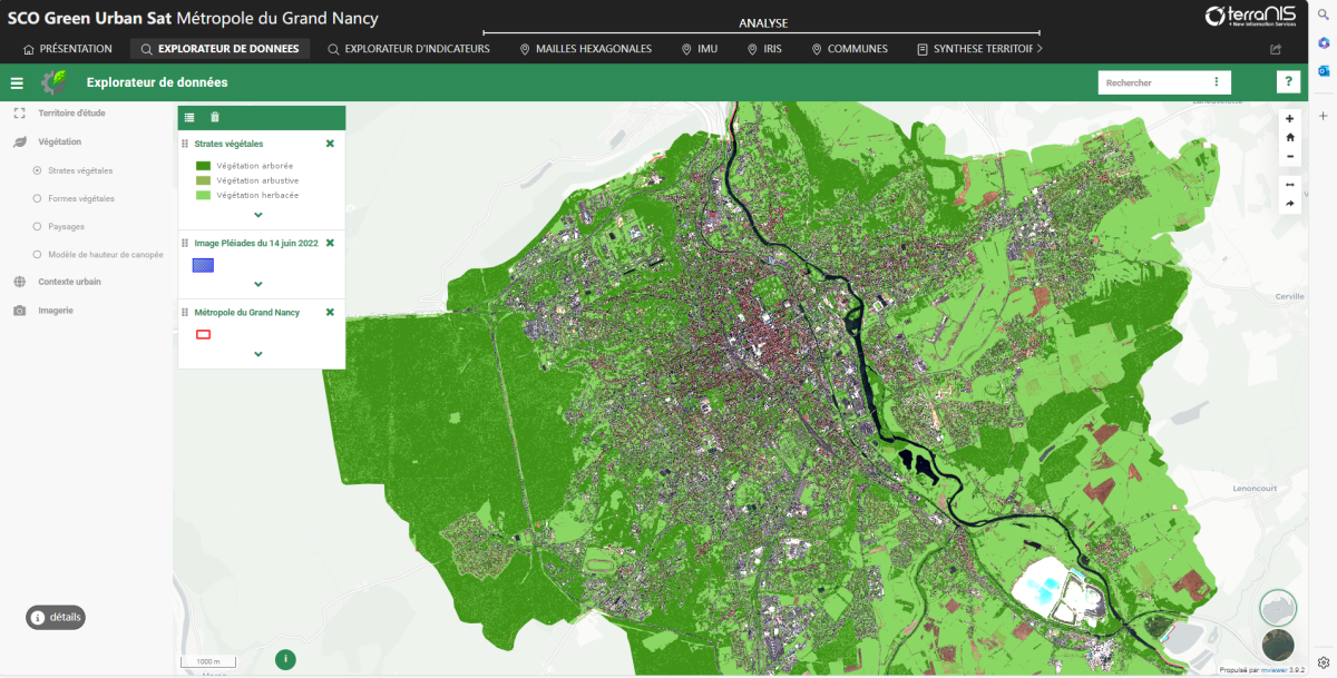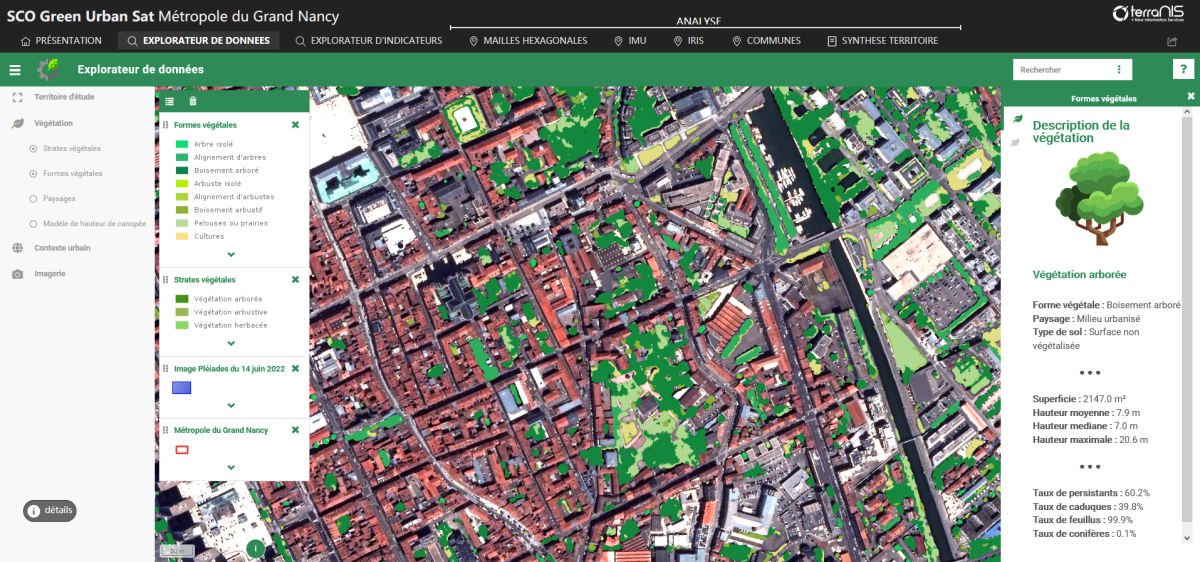Le Démonstrateur de l’interface avec la couche finale de végétation et les indicateurs associés sur la métropole du Grand Nancy en ligne sur le site de TerraNIS