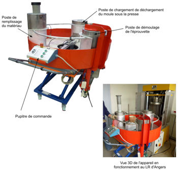 Le système a été développé pour le Laboratoire Régional d’Angers, afin de simplifier et augmenter le rythme de compactage d’éprouvettes par une presse 3R. Conçu pour cette presse 3R, il peut être aisément adapté à d’autres types de presse.