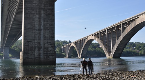 Inspection des piles du pont d'Iroise : Dans le cadre de l’inspection détaillée et de l’expertise des haubans du pont de l’Iroise dans l’estuaire de l’Elorn, le Cerema a utilisé un drone pour l’inspection des deux piles principales du pont, situées au milieu de l’Elorn. L’inspection par drone du Cerema constitue la première inspection de ces deux piles, qui sont impossibles d’accès aux cordistes en raison de leurs dispositions constructives.