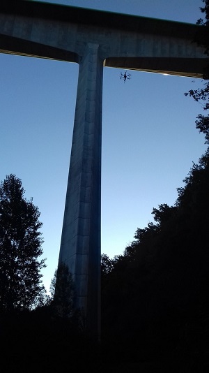 Viaduc du Viaur : ce viaduc repose sur quatre piles dont les deux plus hautes (+ de 100 m) sont inaccessibles aux cordistes (piles encastrées). L’inspection des piles, a été réalisée au moyen d’un drone, sur trois jours en septembre 2019. La raison qui a motivé l’emploi du drone était de ne pas perturber la circulation.