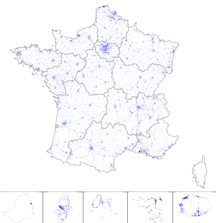 - Enfin, ces données sont complétées par les contours construits de manière automatique à partir des locaux d’activités déclarés à la DGFIP pour la taxation foncière des propriétés baties (fichiers fonciers) qui sont dans un deuxième temps clustérisés par opération géomatique, si ils n'ont pas d’intersection géographique avec les contours issus des étapes précédentes..