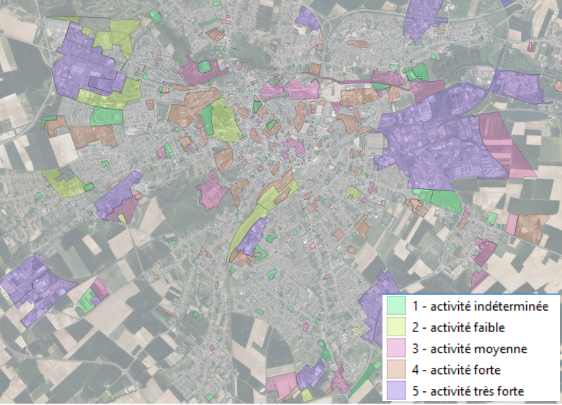 La carte ci-dessus montre la répartition spatiale des différentes intensités d'activité sur un territoire donné. Les sites présentant une intensité d'activité élevée ("activité très forte") sont principalement situés en périphérie urbaine et correspondent potentiellement à des zones d’activités économiques (ZAE).