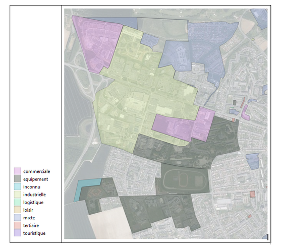 Notamment du fait du mode de délimitation à partir des fichiers fonciers (clustering géomatique), les fonciers à usage d’activité couvrent un spectre plus large que les seules zones d’activités économiques. On y trouve notamment des zones d’activités de fait, ainsi que des espaces de centre-ville.