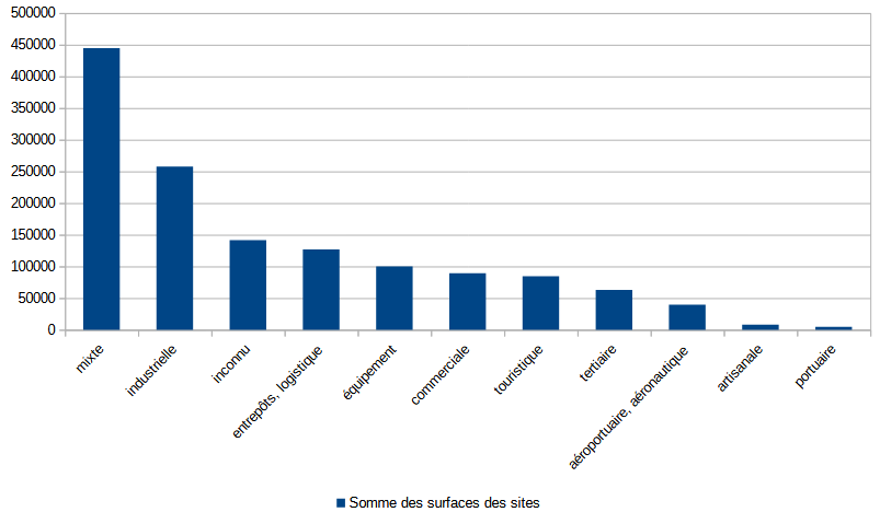 Le graphique ci-dessus représente la somme des surfaces de l’ensemble des sites dans la base, en fonction de leurs vocations dominantes. Le graphique souligne une forte utilisation des surfaces pour des usages mixtes et industriels, tandis que d'autres vocations dominantes, comme l’artisanale ou le portuaire, ont une moindre importance en termes de superficie.