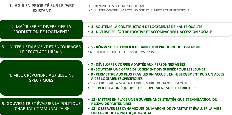 Dans ce contexte le PLH de l’Agglo Hénin Carvin a adopté 5 orientations et 13 objectifs résumés sur l’illustration suivante :