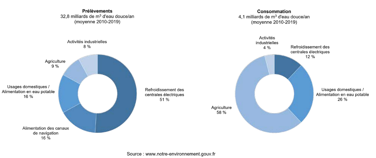 Près de 33 milliards de m3 d’eau douce sont prélevés chaque année en France pour les besoins des activités humaines. La part non restituée aux milieux aquatiques (la consommation d’eau) représente environ 4,1 milliards de m3, soit 12 % des prélèvements [8]. La répartition par catégories d’usages diffère selon qu’il s’agit des prélèvements ou de la consommation d’eau (cf. les deux graphiques ci-dessous).