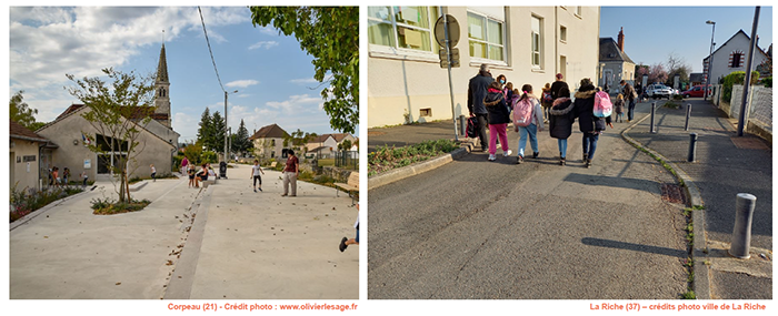 A Corpeau, un village de 1000 habitants en Côte d’Or (21), la piétonisation s’est faite en plusieurs temps. La rue a été fermée à la circulation et deux parkings positionnés à chaque extrémité. Puis un aménagement qualitatif a été réalisé, avec des espaces végétalisés et pédagogiques tout le long, en lien avec des travaux de mise en accessibilité du bâtiment de l’école.