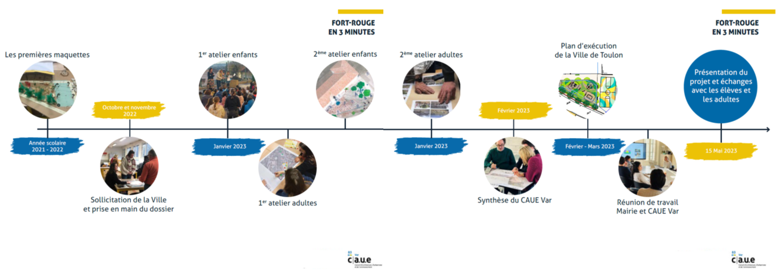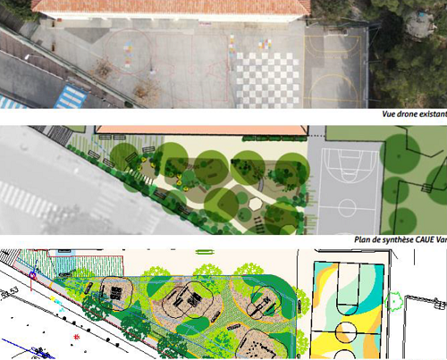 Le CAUE du Var suit actuellement neuf projets de cours-jardins dont 2 ont déjà pu voir leurs travaux commencer. L’accompagnement du CAUE est encadré par la loi et concerne ainsi les phases allant jusqu’au préprogramme (spatialisation des nouveaux usages sous forme de schéma) ainsi que les premiers temps de l’appropriation de la cour avec la réalisation d’une charte d’utilisation avec les enfants.