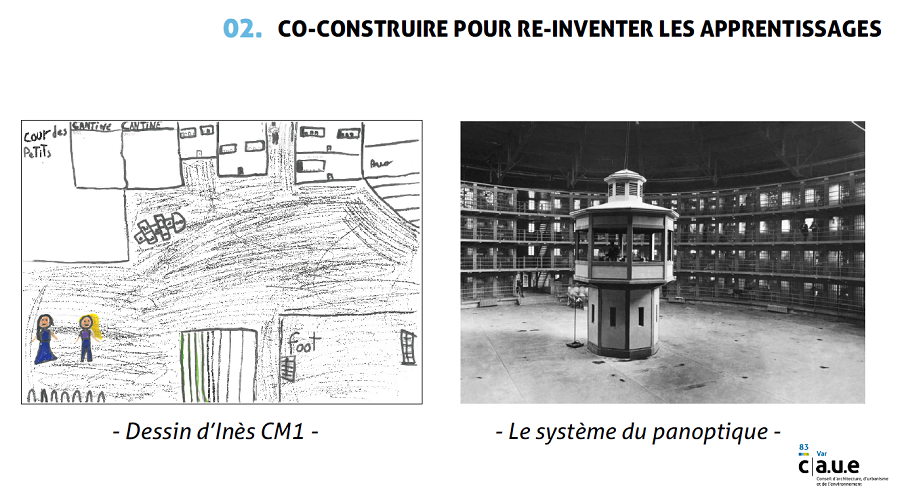 Au-delà d’être un projet technique, c’est un projet qui répond à l’urgence climatique et à l’urgence pédagogique. Pendant des dizaines d’années les cours ont été construites pour répondre à des enjeux d’adultes : sécurité, hygiène, entretiens. Cela a mené à des formats de cours nues et coupées du monde, proches du système du Panoptique, dispositif théorisé par Michel Foucault et répondant aux enjeux des cours de prisons.