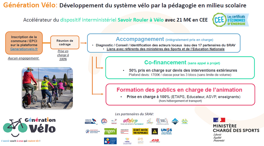 La FUB porte différents programmes CEE (Certificat d’économie d’énergies) dont Génération Vélo, un programme interministériel en lien avec l’éducation nationale. Le Savoir rouler à vélo - présenté ici par Robin Allory de Génération Vélo et Lucie Clément de la ville de Velaux - porté par le ministère des sports est accompagné dans sa mise en place par la FUB. Il s’agit d’un accompagnement territorial qui s’intègre dans la loi LOM en complémentarité de la prévention routière.