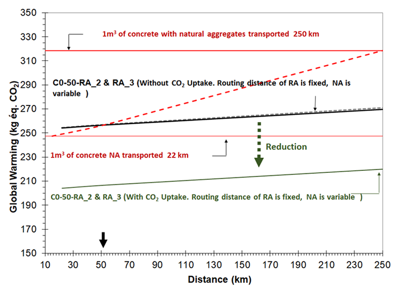Plus particulièrement, un modèle d’évaluation de la distance de rentabilité écologique des granulats recyclés et naturels (GN) a été établi afin de définir la distance optimale à partir de laquelle il serait plus bénéfique écologiquement d’utiliser des granulats recyclés plutôt que des granulats naturels.