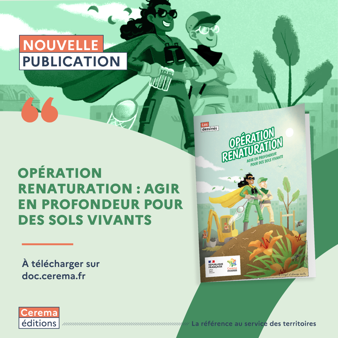 C'est en bande dessinée que le Cerema a choisi d'expliquer la renaturation des sols : découvrez en images les enjeux de la renaturation, comment définir une stratégie et des exemples de bonnes pratiques.