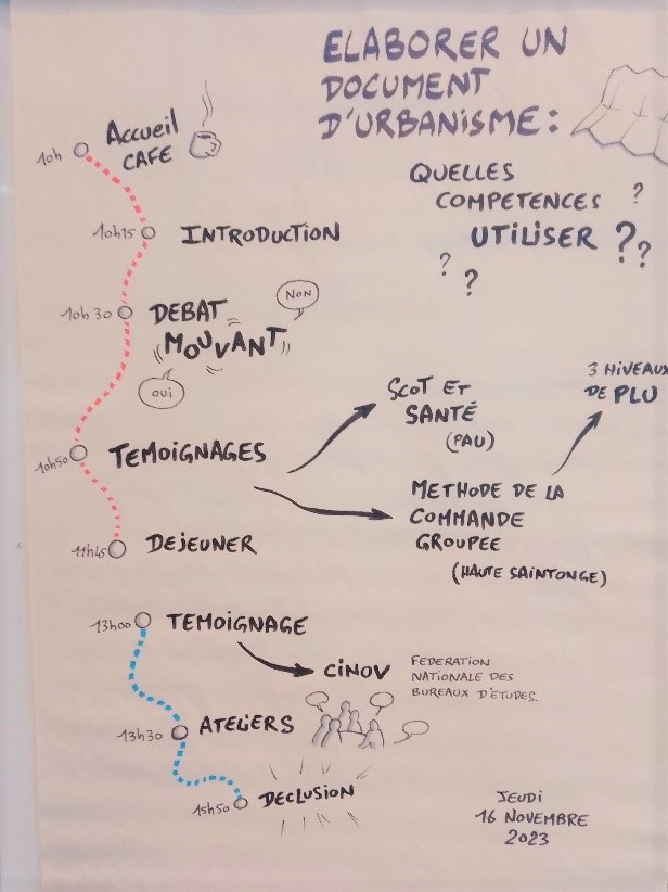 L’après-midi a été consacrée à un moment de réflexion collective. 3 sous-groupes répartis en ateliers d’une durée de 2h15 ont travaillé à partir d’un jeu de carte cocréé par le CNFPT et le Cerema spécialement pour l’occasion, avec l’appui de Jérôme Arcega-Leclerq, facilitateur graphique.