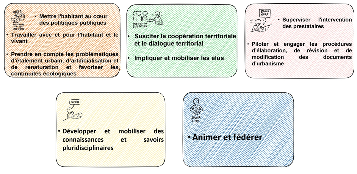 | Acteurs et gouvernance | Impliquer et mobiliser les élus Susciter la coopération territoriale et accompagner le dialogue territorial | Savoir repérer les acteurs et métiers de l’aménagement impliqués dans les transitions territoriales |