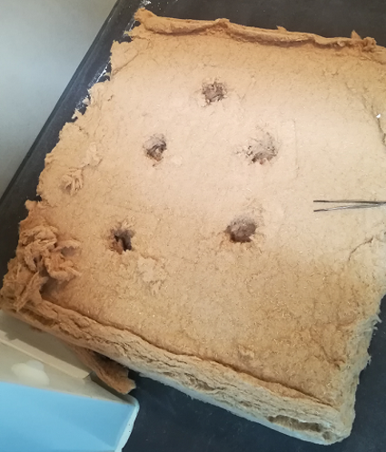 A gauche, à l’intérieur de la cellule expérimentale aux paramètres hygrothermiques contrôlés, Thierry Langlet , de l’université de Picardie, s’apprête à prélever une partie de l’isolant de la paroi. Ce carré de laine de bois, étudié à droite, est découpé en plusieurs points par Yves Andres, de l’IMT Atlantique, pour l’étude des prélèvements biologiques. Photos prises par le Cerema à l’Université de Picardie.