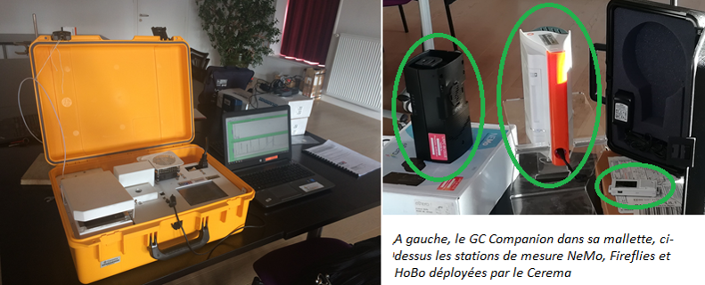 Les moyens analytiques déployés sont partiellement redondants, afin d’assurer une possibilité de contrôle et de comparaison ainsi qu’un suivi précis au fil du temps, tout en permettant l’exploration d’une vaste gamme de composés. Dans ce cadre, les analyse du Cerema par le GC sont plus rapides, car réalisées in situ, avec une fréquence d’échantillonnage élevées, tandis que les analyses de l’IMT Lille-Douai sont moins rapides mais plus précises, faites a posteriori en laboratoire et permettant de quantifier davantage de composés.