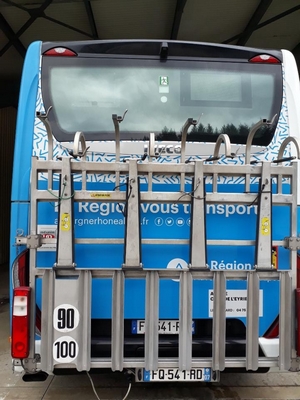 Source : GaléoUne diversité de systèmes d’emport a déjà été testée aujourd’hui par différents exploitants et AOM, permettant l’emport de vélos à l’intérieur ou à l’extérieur de l’autocar, à l’horizontal ou à la verticale. Chacun des systèmes présentent des avantages et inconvénients, selon les usages et les caractéristiques de la ligne : capacité, facilité d’installation, sécurité et localisation des usagers par rapport à l’autocar lors du chargement, longueur du dispositif en lien avec le profil de la voie, etc. Le coût de ces systèmes varie entre 1800€ et 8000€ environ selon leur capacité, pour des capacités théoriques de 3 à 8 vélos (soit entre 900€et 1300€ par vélo environ). Le chargement de vélo à assistance électrique, dont le poids est supérieur aux vélos « musculaires » est à anticiper pour assurer la fiabilité et la robustesse du système. Le système le plus utilisé semble être celui d’un rack situé à l’arrière du véhicule et permettant l’emport de vélos accrochés à la verticale (cas du système utilisé sur le réseau Transisère par exemple).