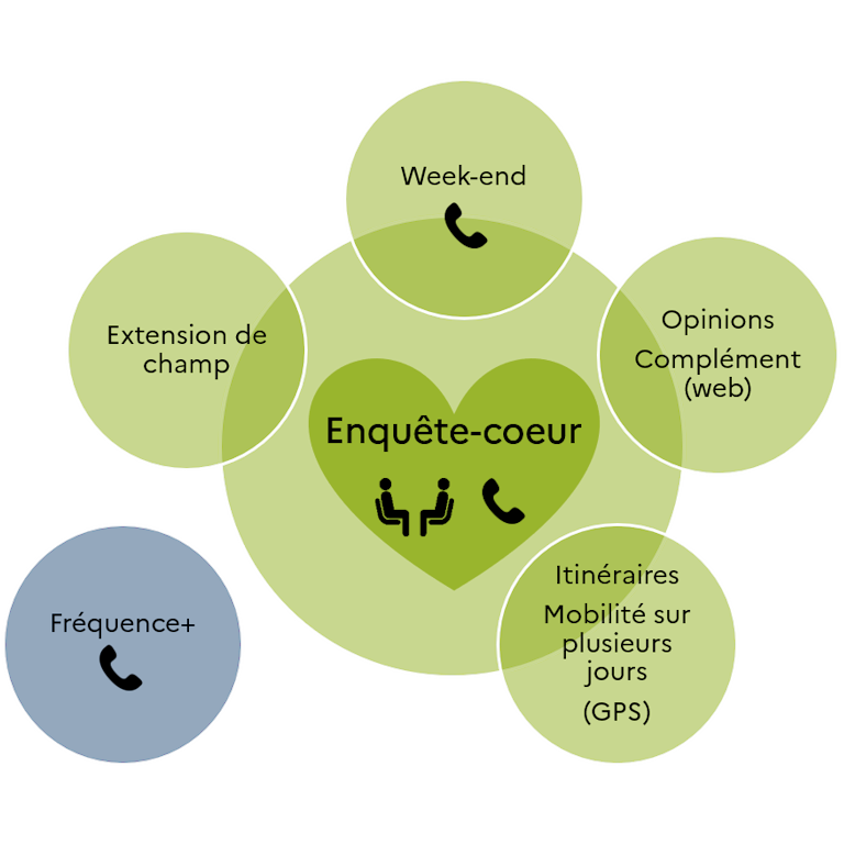 Une EMC² est une enquête modulable qui s'articule autour d'une enquête - coeur standardisée qui permet de recueillir l'essentiel des données de mobilité en gardant une cohérence totale avec les enquêtes EMD, EDVM et EDGT réalisées par le passé. Ce socle commun permet de continuer à réaliser des comparaisons entre territoires et dans le temps.