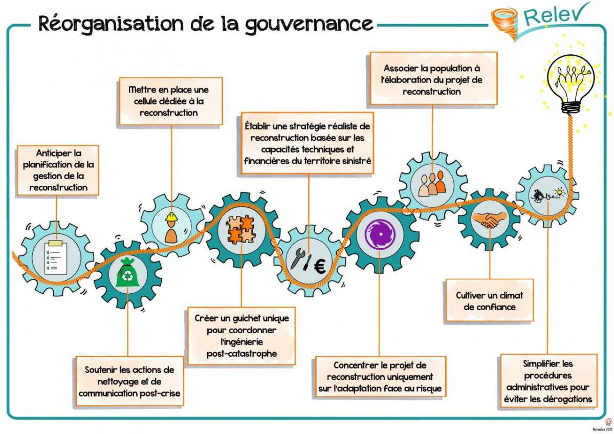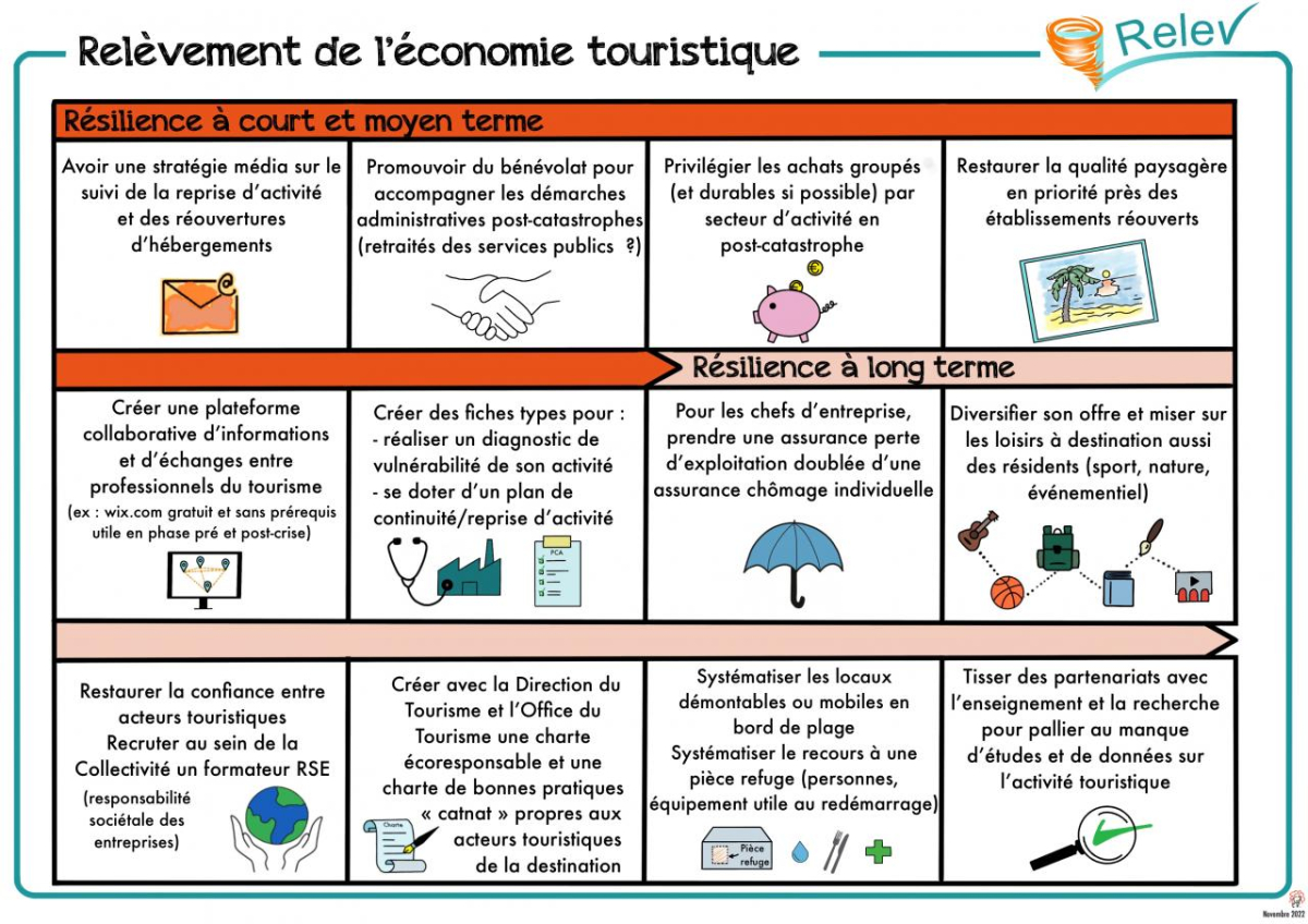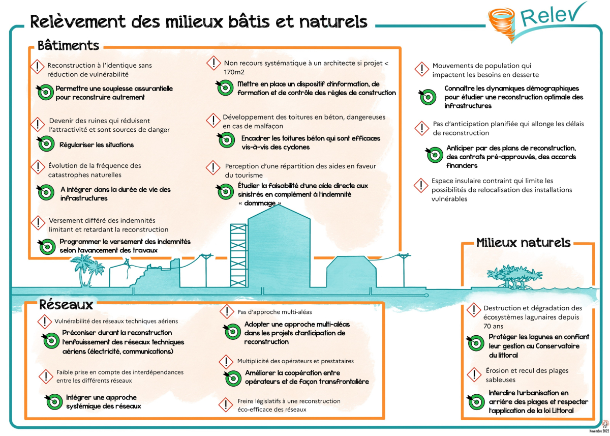 Les enseignements du projet Relev documentent la gestion de la phase de reconstruction post-catastrophe à Saint-Martin et Saint-Barthélemy, et soulignent la pertinence de planifier cette phase selon des modalités proches de celles déjà adoptées pour anticiper et préparer la gestion de crise. L’analyse interdisciplinaire a permis de mieux comprendre les liens de causalité entre la gouvernance de ces 2 îles, le relèvement psychosociologique des sinistrés, la reconstruction des infrastructures endommagées, la reprise des activités touristiques et l’histoire de l’urbanisation d’îles exposées aux risques naturels.