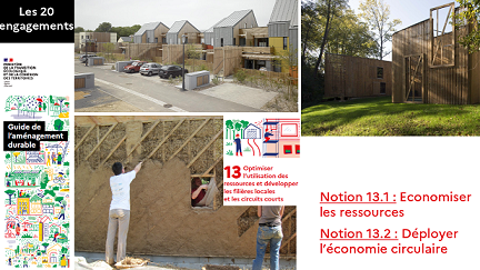 Corentin MOURAUD de la SCOP L'Aronde et membre du Collectif explique que sur le quartier, hormis le Pisé et les BTC (Briques de terre comprimée), toutes les techniques, adobe, bauge... peuvent être utilisées. Corentin MOURAUD a rappelé l'existence des guides de bonnes pratiques pour les différentes mise en œuvre de la terre : bauge, pisé, BTC, enduits, torchis, terre allégée.