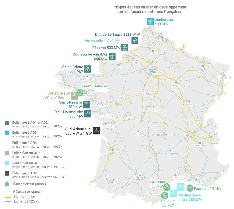 La construction des parcs issus du premier appel d’offres lancé en 2011 a démarré et les premières éoliennes entreront en fonctionnement d’ici 2022. D’autres projets sont en cours d’élaboration : deux sont au stade de la procédure de mise en concurrence en Normandie et en Bretagne et deux autres au stade de la préparation du débat public en Méditerranée et en Sud-Atlantique.
