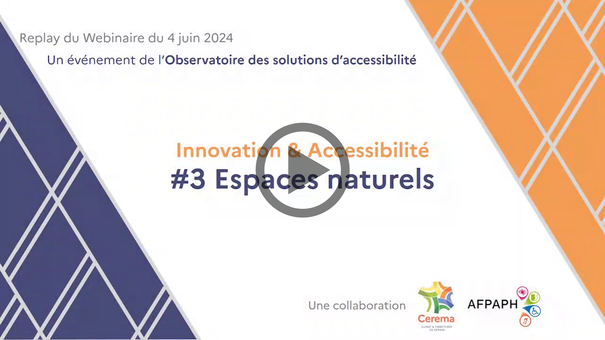 Dans le cadre de la création de l’Observatoire des solutions d’accessibilité, le Cerema et l’AFPAPH ont lancé une série de webinaires intitulée "Innovation & Accessibilité" présentant des bonnes pratiques et des innovations favorisant l’accessibilité pour les personnes handicapées et plus largement les personnes à mobilité réduite. La thématique développée lors de la troisième session de la série portait sur les espaces naturels.