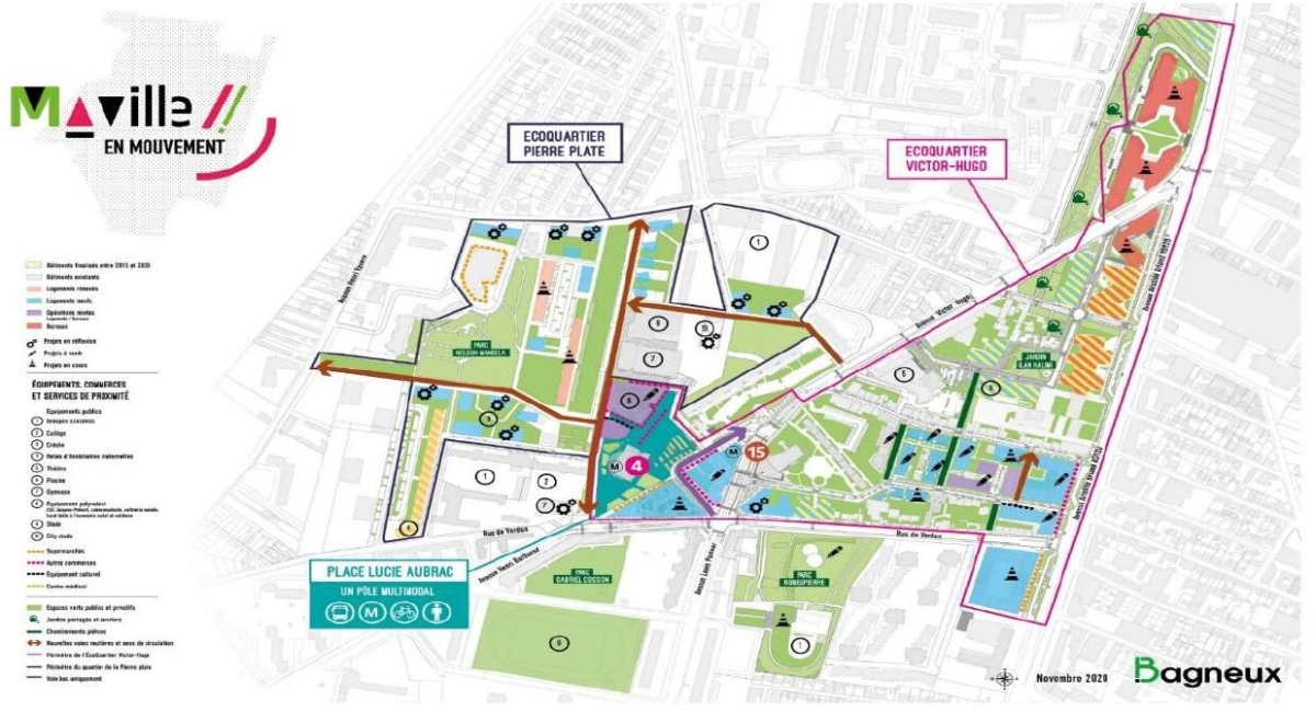Elsa Sautter, directrice opérationnelle à SADEV94 (aménageur), présente le projet urbain du quartier nord de Bagneux (92) en petite couronne parisienne. Ce projet répond à la volonté de la ville d’accompagner l’arrivée des nouveaux métros (prolongement de la ligne 4 du métro et ligne 15 du Grand Paris Express) par le renouvellement urbain afin de diversifier l’offre de logements, de créer de nouveaux équipements et réaménager les espaces publics pour répondre à de multiples besoins (végétalisation, mobilités, animation commerciale, convivialité…).