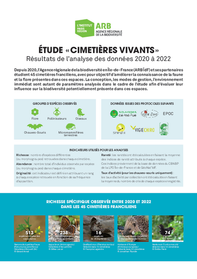 En 2020, l’ARB Ile de France a lancé une étude "Cimetières vivants" sur une durée de 4 ans (2020-2023), avec pour objectif de qualifier et de mieux connaitre la biodiversité dans 45 cimetières franciliens, ainsi que d’évaluer les facteurs pouvant influencer cette diversité. Jonathan Flandrin a d’abord illustré le changement de culture dans la conception des cimetières : d’espaces fortement minéralisés, les cimetières redonnent peu à peu la place au végétal de manière plus ou moins structurée, un moyen de renforcer le sentiment de quiétude pour les familles qui viennent se recueillir.