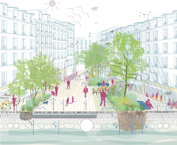 La renaturation est au cœur du processus de conception des espaces publics, avec la volonté de la collectivité, de créer des espaces perméables et support d’usages. La ville attache une grande importance à la participation des habitant.es en étant associé.es à toutes les étapes, mais aussi l’ensemble des acteurs du projet (transporteurs, investisseurs commerciaux, promoteurs, bailleurs…). De nombreuses contraintes et prescriptions techniques sont à prendre en compte et supposent des compromis et négociations, à la fois techniques et financières, entre les différents acteurs de la fabrique. Par exemple, la question de l’intermodalité est un enjeu important, avec l’interconnexion de deux nouvelles lignes de métro, mais également une offre de bus. Il est souligné l'importance du travail de paysagiste pour rendre visible la bonne prise en compte des contraintes énoncées.