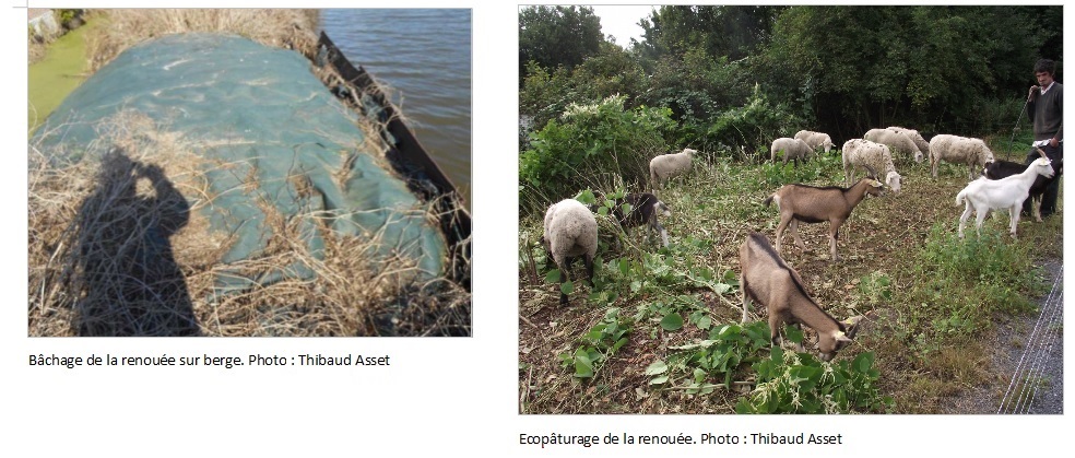 Des ont donc été conduites dans le cadre de l’association SPIGEst, en s’appuyant sur la littérature scientifique et un protocole de suivi terrain. L’effet d’un fauchage fréquent (toutes les 5 ou 10 semaines), du broyage et de la collecte des tiges permet ainsi de faire baisser drastiquement les nuisances de la plante liées à sa taille (visibilité routière, accès pour la surveillance, etc.) et à l’accaparement des ressources. Cette régularité de fauchage force la plante à puiser dans ses ressources, sans pour autant lui laisser l’opportunité de les reconstituer. Ainsi la plante régresse, permettant d’envisager l’implantation d’un couvert végétal compétitif adapté au milieu, dans le but de recoloniser l’espace.