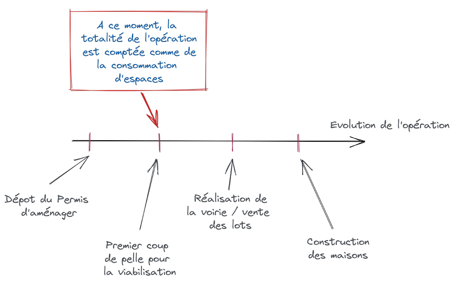 La consommation d’espace associée est comptabilisée à partir du moment où l’aménagement est commencé. Une opération peut représenter un aménagement de 5 ha autant qu’une unique maison située sur une parcelle. Ainsi, si un aménagement comprend deux phases, la méthode identifiera une unique opération dès lors que la procédure liée au permis d’aménager est commune. À l’inverse, si deux PA sont déposés à deux années d’intervalle, il s’agira de deux opérations différentes.