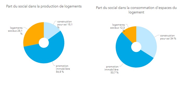 Sur cette période et si on exclut de l’analyse les opérations d’une unique logement privé (construction pour soi), le logement social représente 33 % des logements en extension et 19% de la consommation d’espace pour le logement.