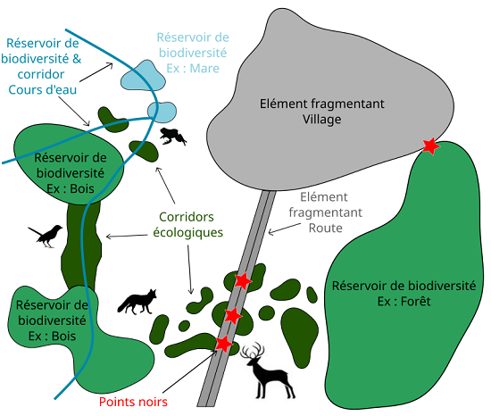 - Les corridors écologiques : zones servant aux déplacements des espèces entre les réservoirs de biodiversité ;