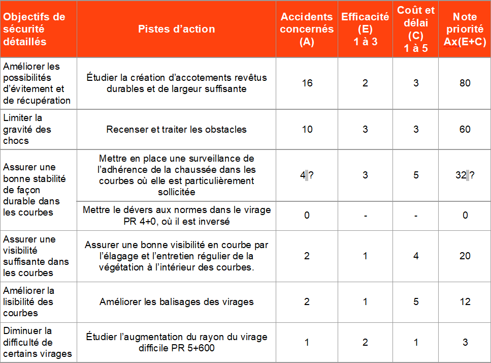 A la suite du diagnostic qui a permis d’identifier les principales causes d’accidents en lien avec la route, le Cerema a établi des objectifs de sécurité déclinés en pistes d’actions détaillées et hiérarchisées selon les gains espérés.