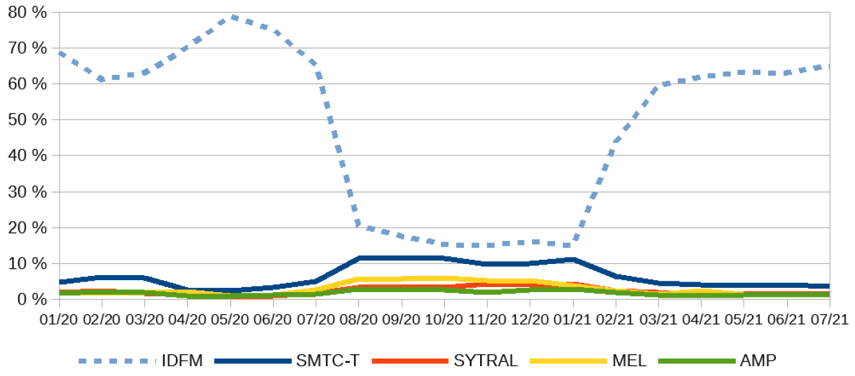 - La localisation géographique des trajets : à partir du 1er confinement, les trajets sur le ressort territorial de Tisséo sont majoritairement en rabattement/diffusion et relient une commune hors du RT à une commune dans le RT. Cette tendance se poursuit par la suite.