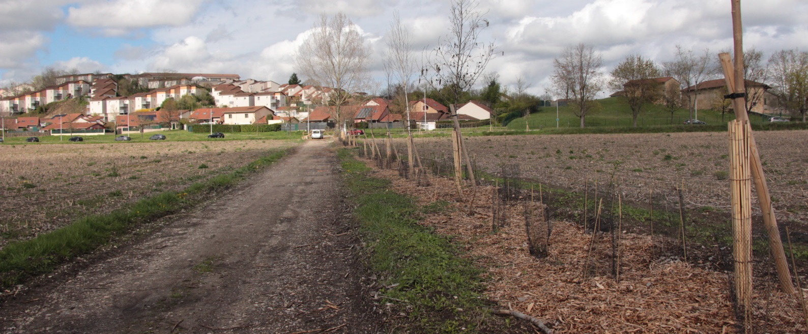 Ce site est situé entre une zone agricole et une zone d’activités, en bord d’autoroute, et fait l’objet de plusieurs mesures de restauration et d’aménagement successives. La commune a acquis des parcelles de terrain, dont une partie bordée d’arbres est exploitée par des agriculteurs céréaliers, une autre est une peupleraie qui sera rasée car arrivée à maturité, et qui comprend un cours d’eau dont le lit a été déjà réhabilité et qui a été renaturé dans le cadre d’une mesure compensatoire. Une voie verte longe ce cours d’eau et les champs de maïs, et progressivement cet espace est devenu agréable, accessible pour la promenade.