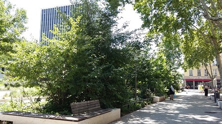 - Le manque de végétal en ville : le végétal joue un rôle important pour rafraîchir, en raison de l’ombre portée, de la photosynthèse qui capte une partie du rayonnement solaire, et de l’évapotranspiration (perte simultanée d’eau par évaporation et transpiration permettant de rafraîchir). En milieu urbain, le végétal s’avère souvent moins présent, au profit de surfaces artificialisées ;
